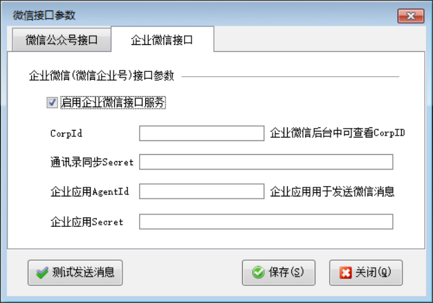 在功能導航窗選擇“擴展應用”—》“微信參數設置”,選擇“企業微信接口”,啟用并配置相關設置。然后點擊測試微信接口。提示測試成功,則可以開業務單據發送微信消息。