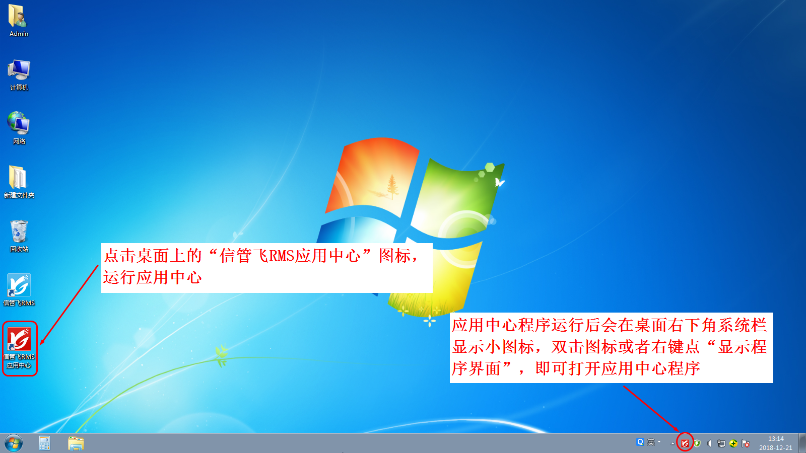 ????主機電腦開機且運行“信管飛應用中心”程序:點擊桌面上的“信管飛RMS應用中心”程序圖標(或者在開始菜單中點擊相應功能),即可打開應用中心程序。應用中心程序運行后會在桌面右下角顯示應用中心圖標: