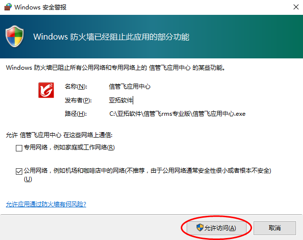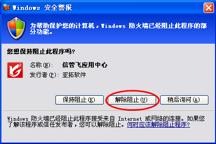 ????首次運行應用中心程序,如果防火墻彈出提示窗口,則Win7系統(tǒng)請點擊“允許訪問”按鈕允許訪問;WinXP系統(tǒng)請點擊“解除阻止”按鈕即可。