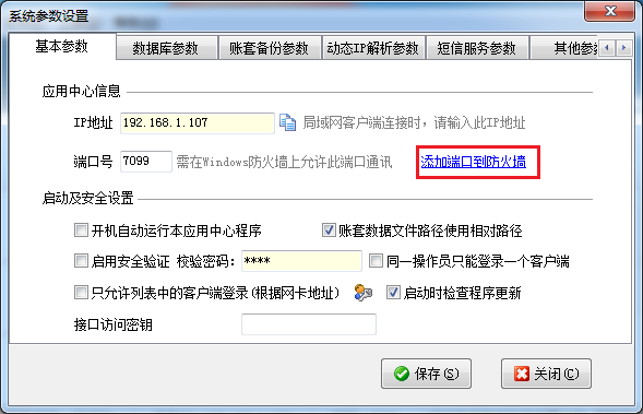 ????主機電腦的Windows防火墻或其他安全軟件的防火墻上需要開放相應的端口,軟件支持自動添加防火墻規(guī)則。在應用中心程序點“系統(tǒng)參數(shù)”可以設置自動添加端口到防火墻。