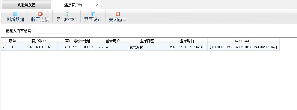 ????在連接客戶端管理內可以管理已連接到主機的客戶端電腦信息,包括客戶端 IP、客戶端網卡地址、登錄操作員、登錄賬套以及登錄時間。