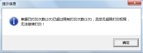 ????通過設置這個參數,可以避免開單人員開單打印后又修改單據,出現軟件中的單據內容與打印出來的單據不一樣的情況。設置報表打印超過打印次數限制后,在業務單據打印中(基礎資料、統計查詢功能中沒有限制)如果單據打印的次數超過限制數量,則軟件會提示如下信息: