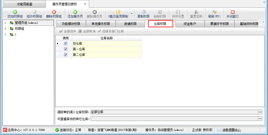 ????⑤ 倉庫權限、資金賬戶權限屬于特殊的數據權限,可根據情況給每個操作員設置可管理的倉庫和資金賬戶。