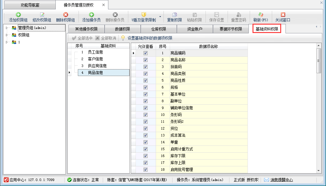 ????啟用此參數后,可以設置每個操作員的可查看的員工信息、商品信息、供應商信息、客戶信息等基本信息數據項,操作員如沒有相應數據權限,將無法查看相應數據項,軟件相應數據將會顯示“***”。