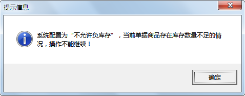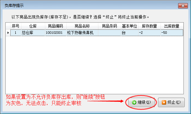 ????啟用“負庫存提示”時,如果單據明細中的商品出現負庫存,則軟件彈出如下提示窗口。如果不允許負庫存出庫,則“繼續”按鈕為灰色無法點擊。