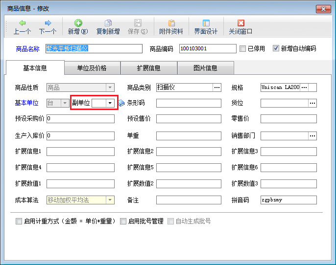 ????副單位用于處理布匹、鋼材等行業,倉庫庫存需要管理兩種單位的數量(比如布匹行業既要知道有多少米,又要知道有多少卷),兩種單位之間并不存在絕對的比例關系(如果是絕對的比例關系,可以使用輔助單位)。