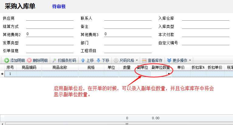 ????啟用商品副單位后,在商品信息中可以維護副單位,在業務單據明細中可以輸入副單位的數量。保存審核單據后,軟件會自動計算倉庫中的副單位數量。