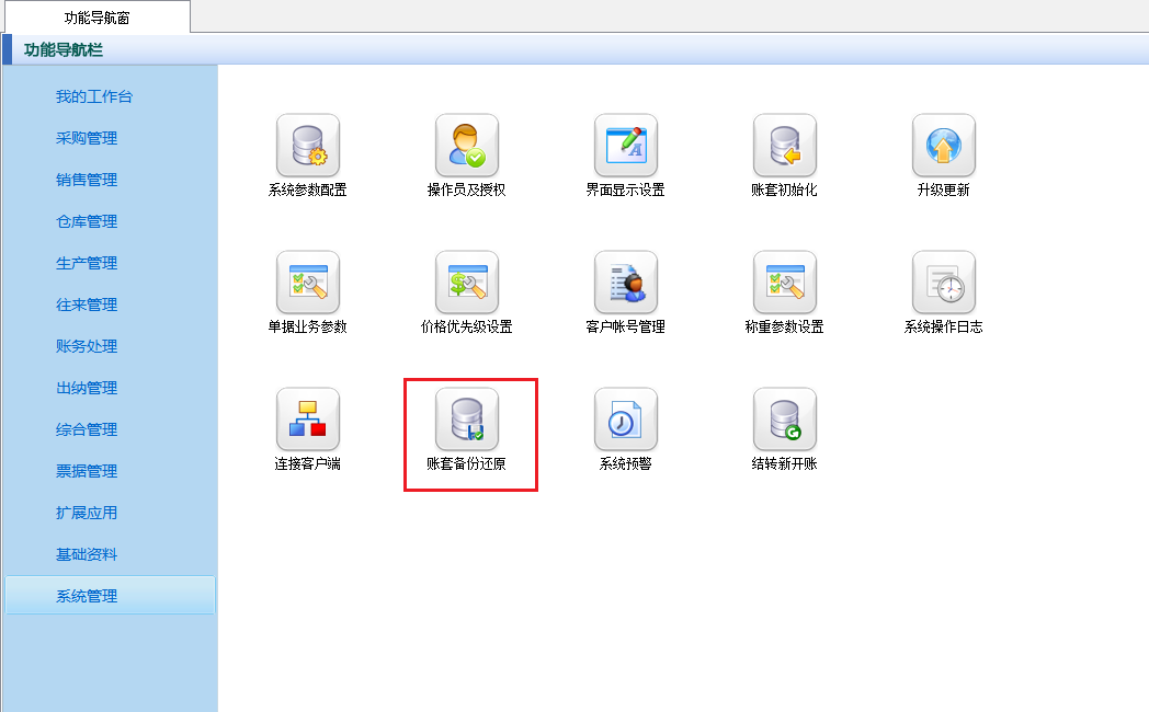 ????在功能導航窗中點擊“系統管理”—》“賬套備份”同樣可以執行賬套備份操作,如下圖所示。