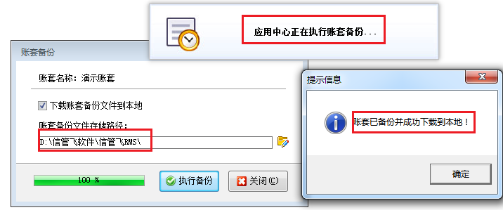 ????① 在點擊“賬套備份”后彈出的賬套備份窗口中直接點擊“執行備份”按鈕進行備份賬套操作時,賬套備份文件的實際存儲路徑是存儲在作為服務器(我們將安裝“信管飛 RMS 應用中心”或者是插有加密鎖的那臺電腦稱為“服務器”)的那臺電腦的軟件安裝目錄下的,而不是備份到當前操作員所登錄的客戶端所在電腦上的。