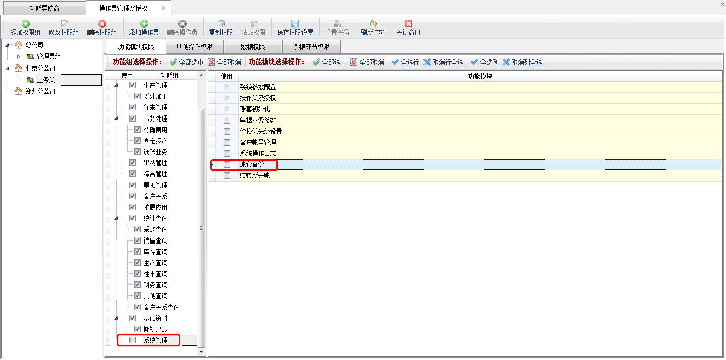 ????③ 如果操作員有“賬套備份”的相應權限,那么可以在客戶端中進行備份賬套操作,如果操作員沒有“賬套備份”的相應權限,則不能在客戶端中對賬套進行備份操作(操作員權限可以在功能導航窗點擊“系統管理”——“操作員及授權”中設置),如下圖所示。