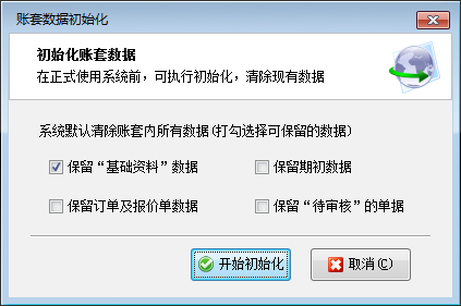 ????默認初始化會刪除所有的數據(包括基礎資料和業務單據),可打勾選擇要保留的數據內容。點“開始初始化”等待軟件執行完成即可。