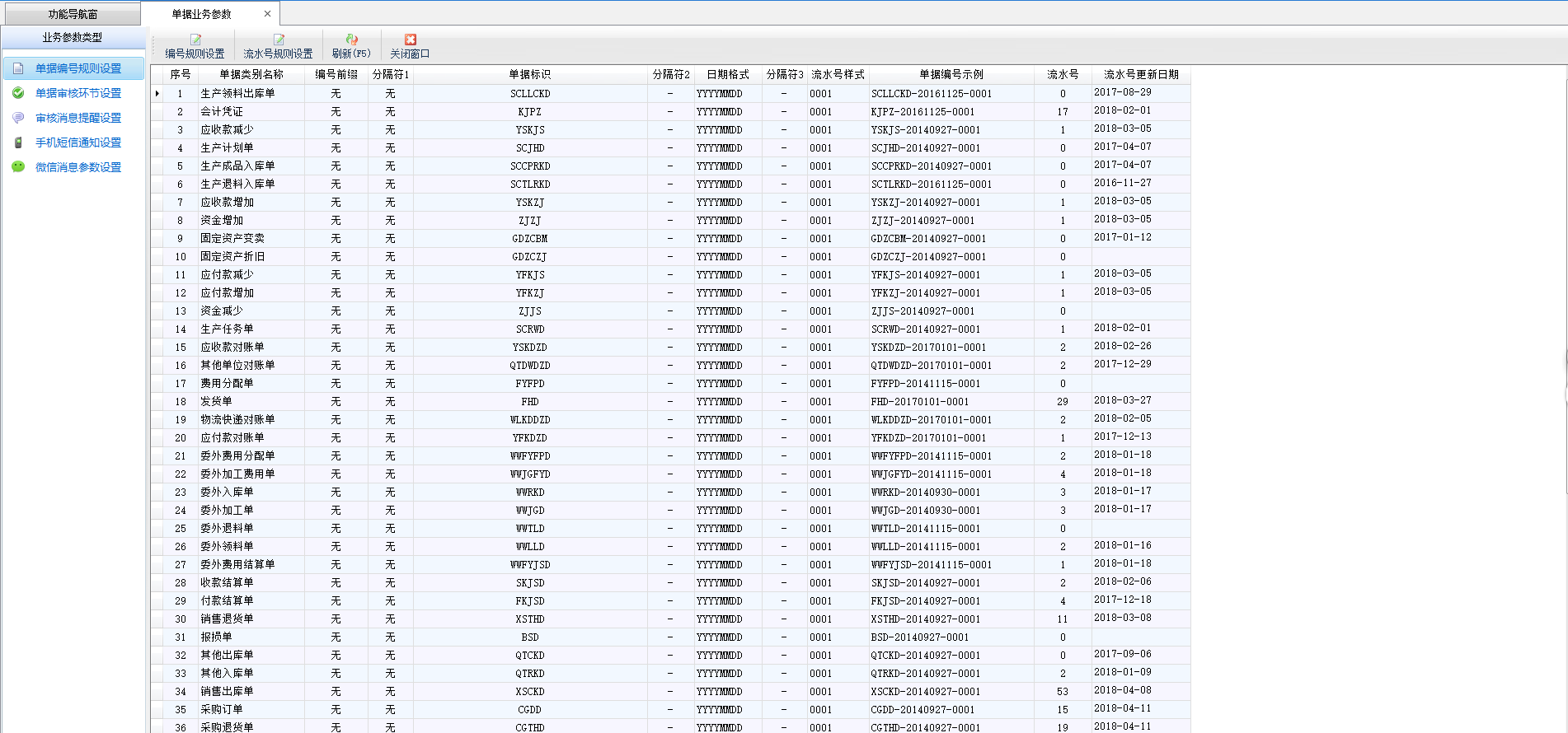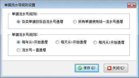 流水號規則設置:點工具欄中的“流水號規則設置”,可以配置單據流水號的生成規則。配置各類單據按各自流水號遞增,還是所有單據采用統一流水號遞增;流水號每年、每月、每天從 1 遞增,還是一直遞增。