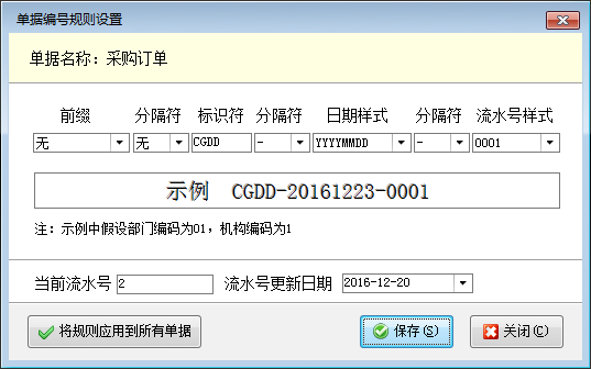 單據編號規則配置:點工具欄中的“編號規則設置”按鈕,可以設置每類單據的編號規則。前綴、分隔符可以設置是否顯示。前綴支持顯示部門或機構編碼。