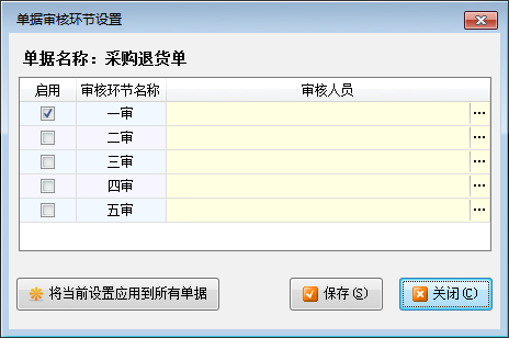 單據審核環節設置:可以設置每類單據的審核環節,最多支持 5 級審核。在界面左側點擊“單據環節設置”,右側顯示所有業務單據的環節信息。然后點工具欄中的“單據環節設置”按鈕,可以配置當前單據的審核環節(審核環節名稱、該環節可進行審核的人員)。點上圖中的“將當前設置應用到所有單據”可以快速將環節配置復制到所有單據。