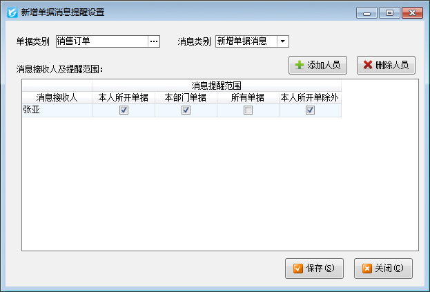 消息接收人以及提醒范圍:可以設置選擇的單據類別下的哪些單據需要提醒,以及提醒的具體接收人。
