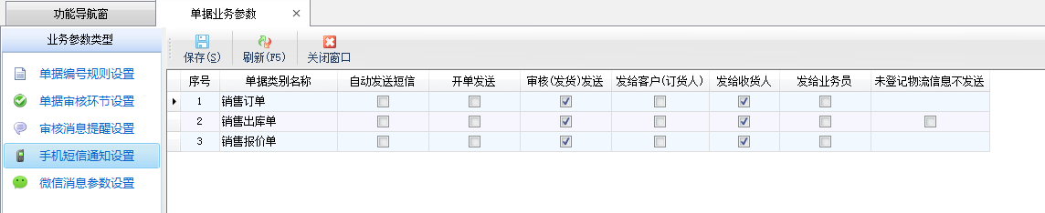 手機短信通知設置:可以設置手機短信發送人員(業務員、收貨人、訂貨人)、發送時間以及是否自動發送等。