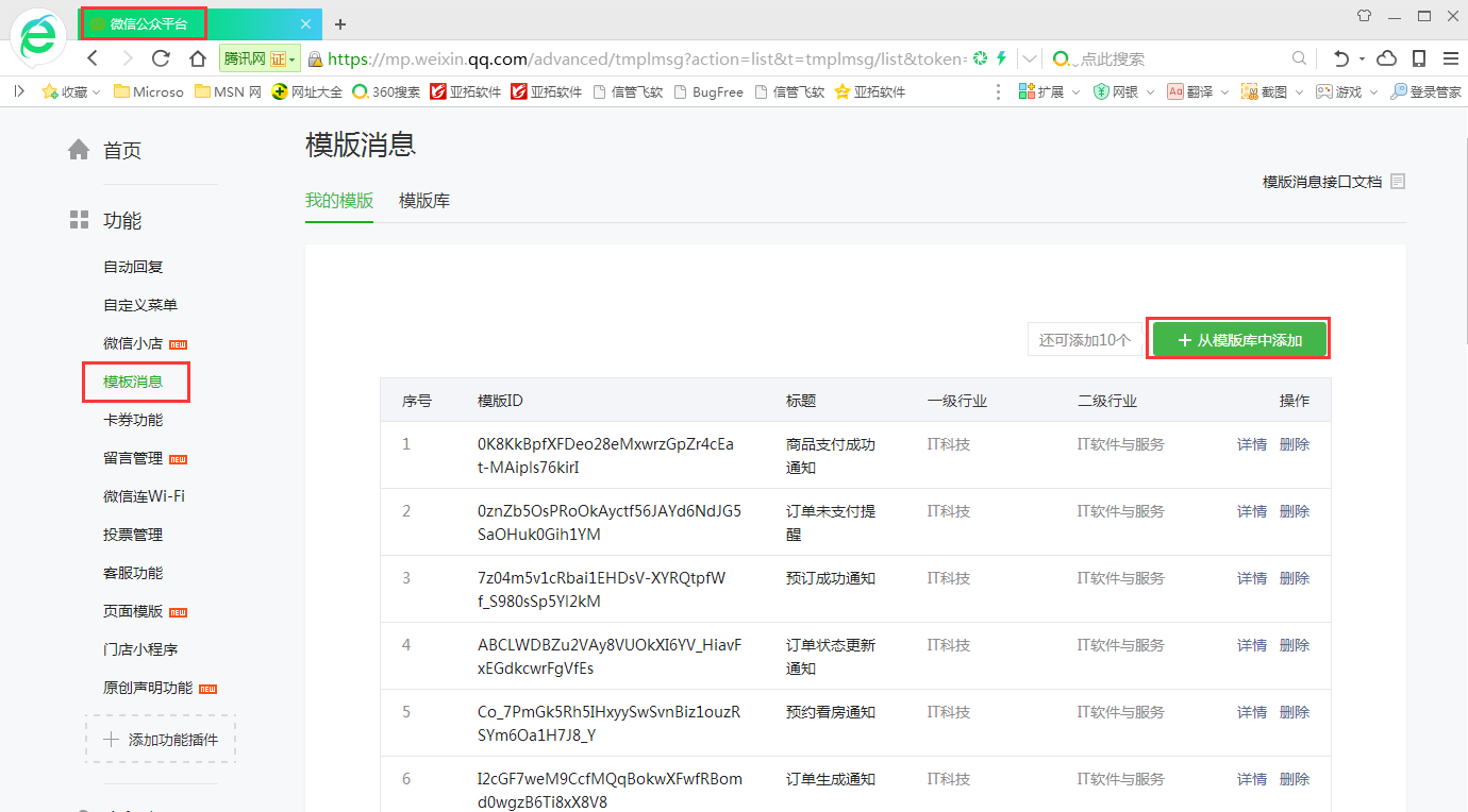????在模板庫中點擊“詳情”,在詳情介紹下進行添加微信消息模板。
