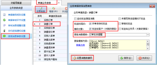 微信消息參數設置:可以設置微信消息是否自動發送,發送時間、發送人員以及對不同單據設置相應的微信消息模板。