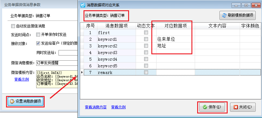 ????微信消息模板選擇“訂單發貨提醒”,點擊“設置消息數據項”可以對應數據項。如下圖所示: