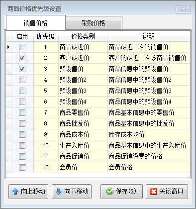 ????打勾啟用表示生效,點“向上移動”和“向下移動”可以調整價格的優先順序,按上一個價格策略沒有獲取到價格,則自動按下一個價格策略獲取價格。