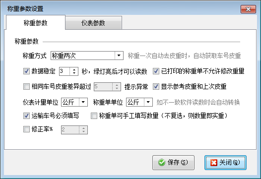 ????稱重參數設置可以設置稱重參數及儀表參數,其中儀表參數請根據所連接稱重設備進行設置,稱重方式支持“稱重兩次”、“稱重一次自動去皮重”、“稱重一次不要皮重”三種方式,并可以設置已打印的稱重單是否允許修改重量、運輸車號是否必須填寫等,用戶可根據自身業務特點進行設置。