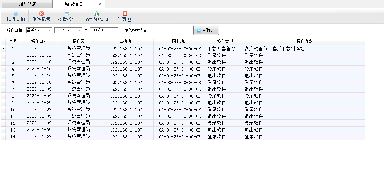 ????在功能導航窗點“系統管理”—》“系統操作日志”即可進入“操作日志”界面,如下圖所示: