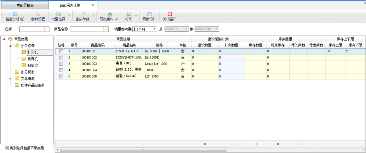 ????智能采購計劃可根據當前庫存情況,并可結合庫存上下限、同期銷售量、銷售訂單數量、待審核數量等條件進行組合運算,從而給出建議的商品采購量。可以把建議結果生成為采購訂單。