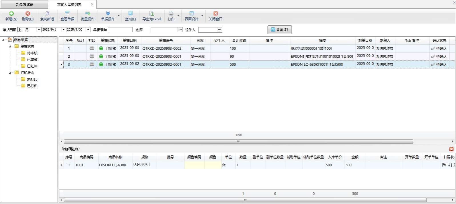 ????其他入庫單的操作與采購入庫單基本一致,這里不再詳述。