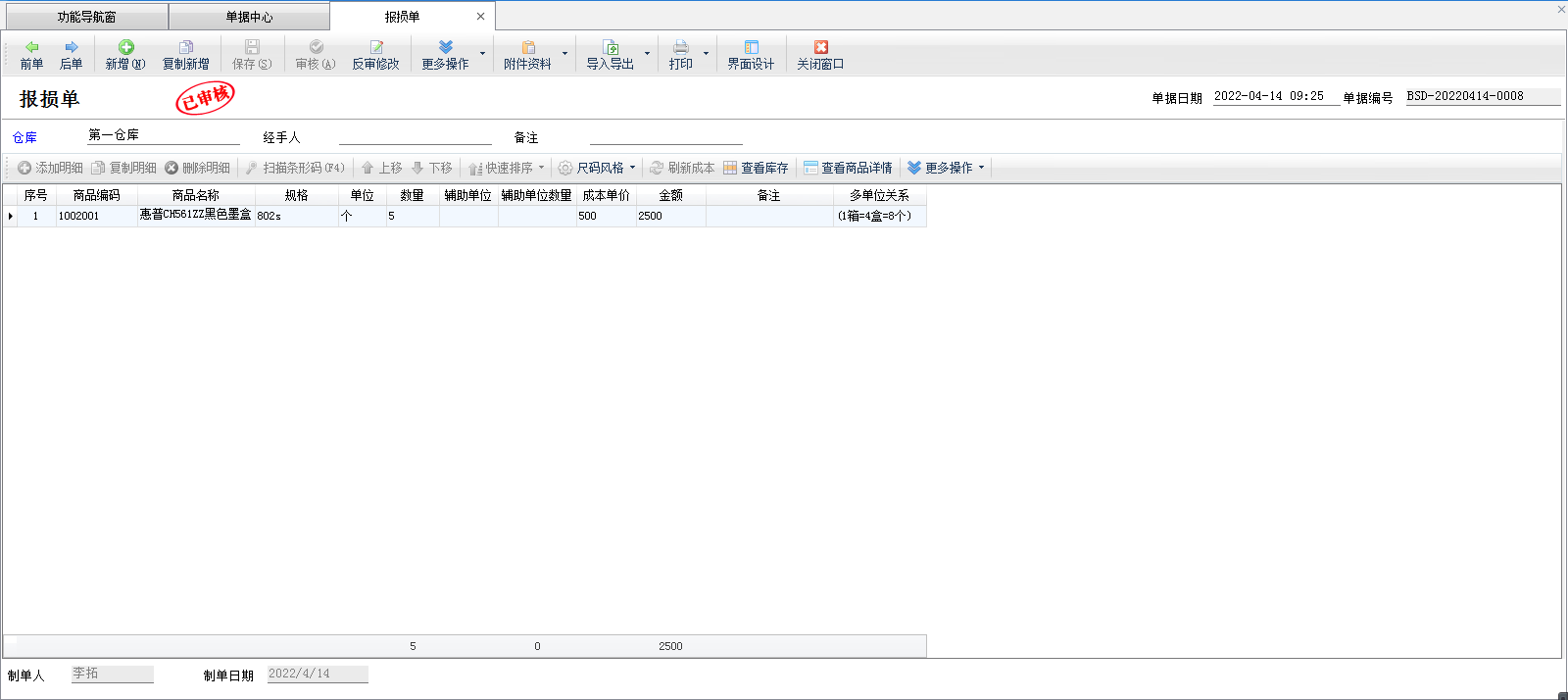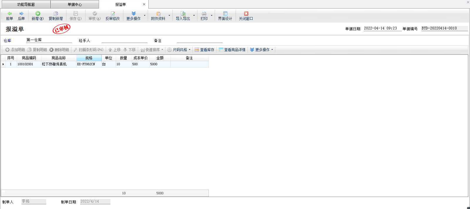 ????報溢單保存審核后,單據明細中相應商品的庫存數量增加;報損單保存審核后,單據明細中相應商品的庫存數量會減少。