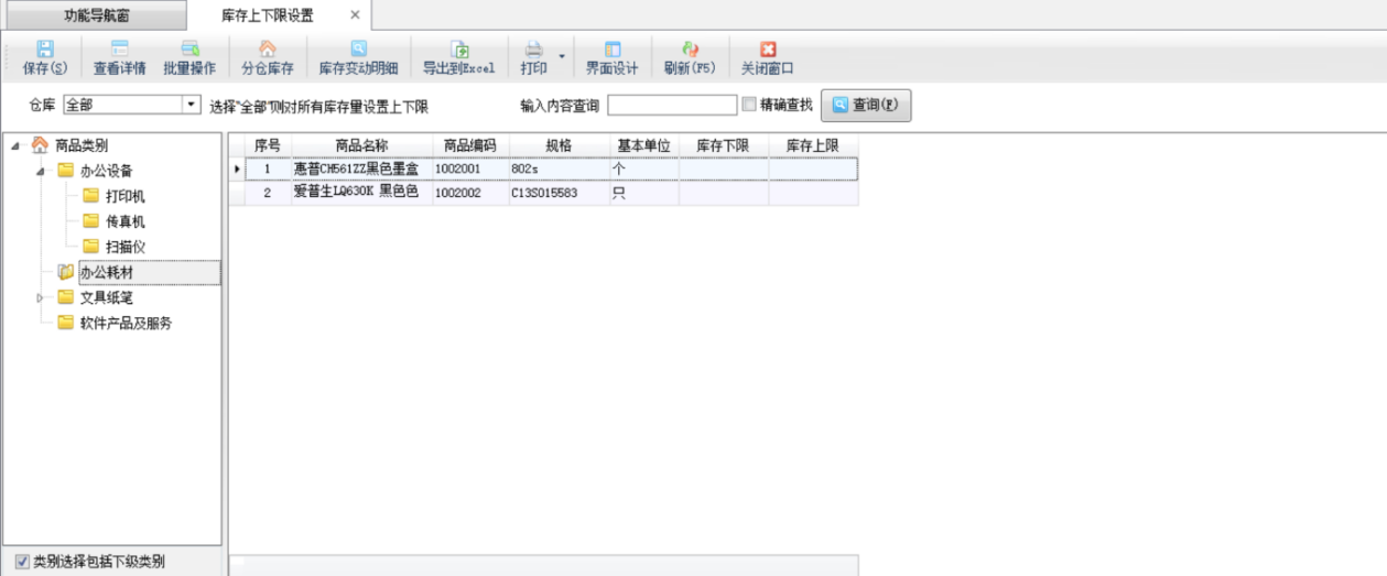 ????在功能導航窗,點“倉庫管理”—》“庫存上下限”,即可進入庫存上下限操作界面,如下圖所示: