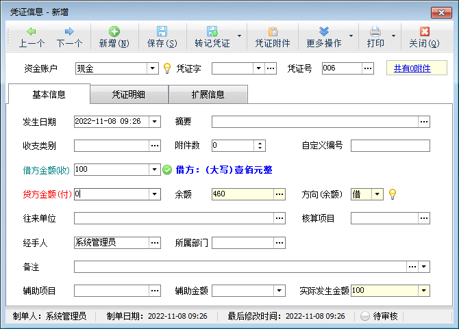 發生日期:必填項,默認為當前機器的時間。需要特別注意的是,發生日期會影響日記帳帳簿的顯示,即次序問題,如果當天一筆本應先“借”(收入)的憑證后錄入,就有可能會導致當天的余額為負數。當然,這不會影響帳戶的余額。
