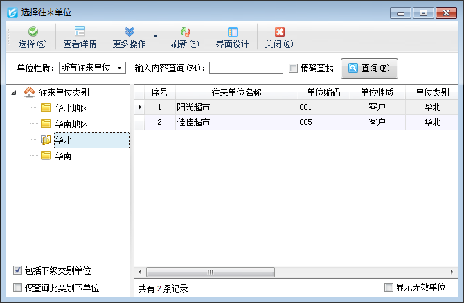 ????在選擇往來單位窗口,可以在輸入框中輸入單位名稱或拼音碼進行檢索(支持模糊查詢,即不需要輸全,比如“陽光超市”,可輸入“陽光”即可查看)。選擇查找到的單位,點擊“選擇”按鈕,或者雙擊記錄即可。