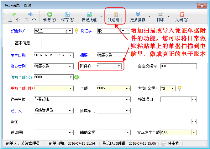憑證附件:點擊“憑證附件”按鈕,可掃描或導入與憑證相關的電子文件。如下圖所示: