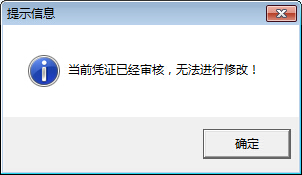 ????選擇一個憑證,然后點擊工具欄中的“修改憑證”按鈕,如果該憑證已審核,則系統不允許修改,彈出如下的提示信息: