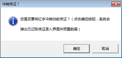 ????選擇一個憑證,然后點擊工具欄中的“更多操作”—》“紅字沖銷”按鈕,系統彈出提示信息,點“確定”按鈕,系統彈出沖銷憑證信息錄入窗口: