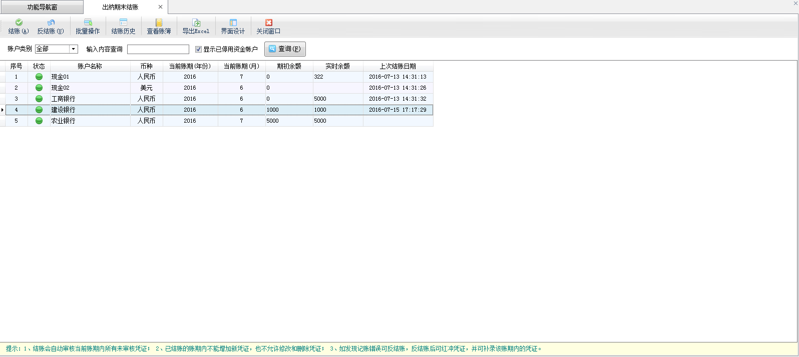 | 3 | 反結帳 | 在帳戶列表中,選擇已結帳的帳戶,點擊工具欄中的“反結帳”按鈕即可返回至上一賬期。 |