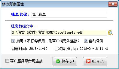 修改:修改賬套屬性時,如果有客戶端已登錄這個賬套,則需要先退出客戶端程序,然后再進行賬套屬性的修改。修改賬套屬性時,可以不啟用賬套(即停用),停用后的賬套客戶端程序無法連接;設置是否自動備份賬套,如果設置自動備份,并且系統(tǒng)參數(shù)設置中也啟用了賬套備份,則軟件會按照賬套備份參數(shù)中的時間間隔定期備份此賬套。