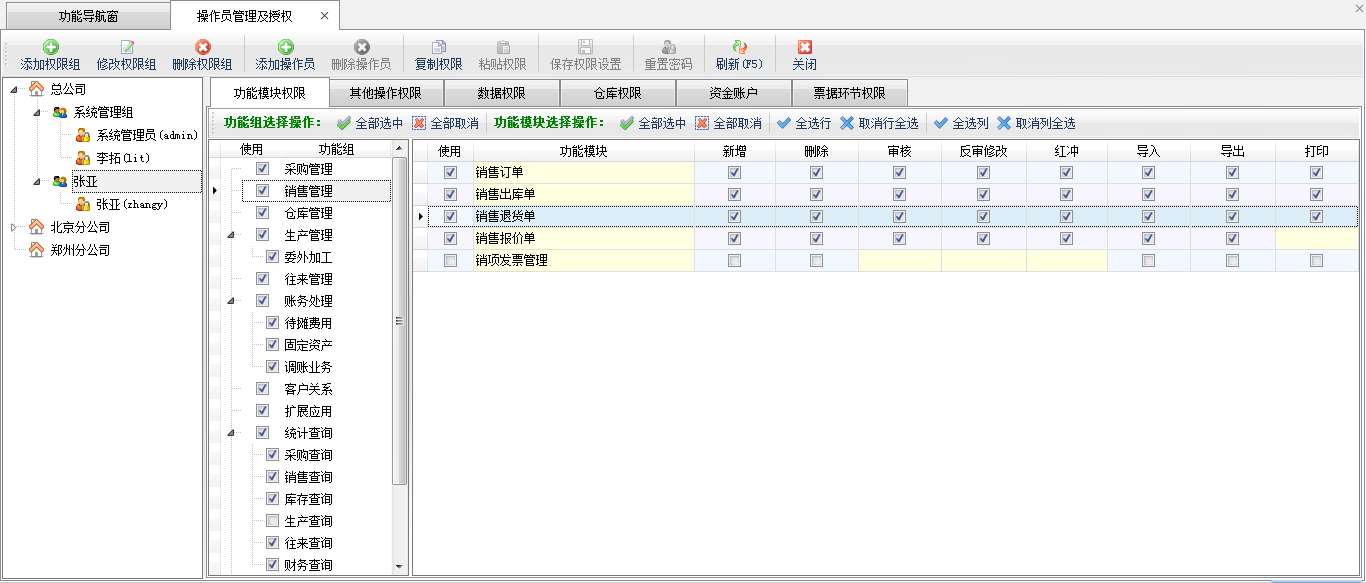 ????(1)設(shè)置功能模塊權(quán)限的時(shí)候,注意打勾選擇“使用”后,還需要設(shè)置詳細(xì)的操作權(quán)限(如新增、刪除、審核、反審修改、紅沖、導(dǎo)入、導(dǎo)出、打印等),如果不設(shè)置詳細(xì)的模塊操作權(quán)限,則只能進(jìn)入功能模塊,但無(wú)法執(zhí)行任何操作。