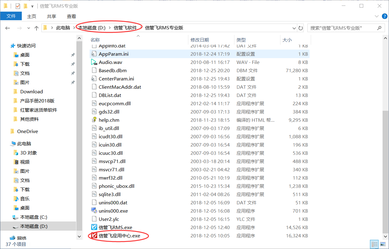 ????在原主機電腦上,先退出信管飛客戶端軟件程序和應用中心程序,然后將程序目錄(默認軟件是安裝在 D:\信管飛軟件)用 U 盤復制到新電腦上。在新主機電腦的程序目錄下,找到信管飛應用中心.exe 文件,點擊運行應用中心。