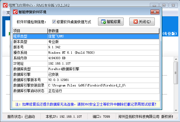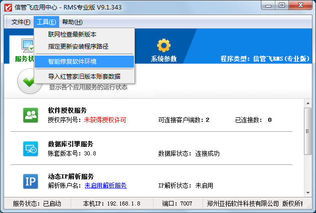 ????在應用中心點擊菜單“工具”—》“智能修復軟件環境”,然后點“智能修復”按鈕,軟件會自動重建數據庫環境,并創建桌面快捷方式。