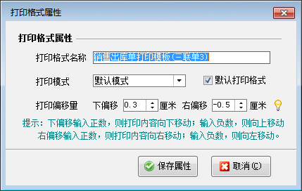 修改格式屬性:點“屬性”按鈕可以修改選中的打印格式模板的屬性。其中打印模式包括默認模式、連續打印模式和填充空行模式。