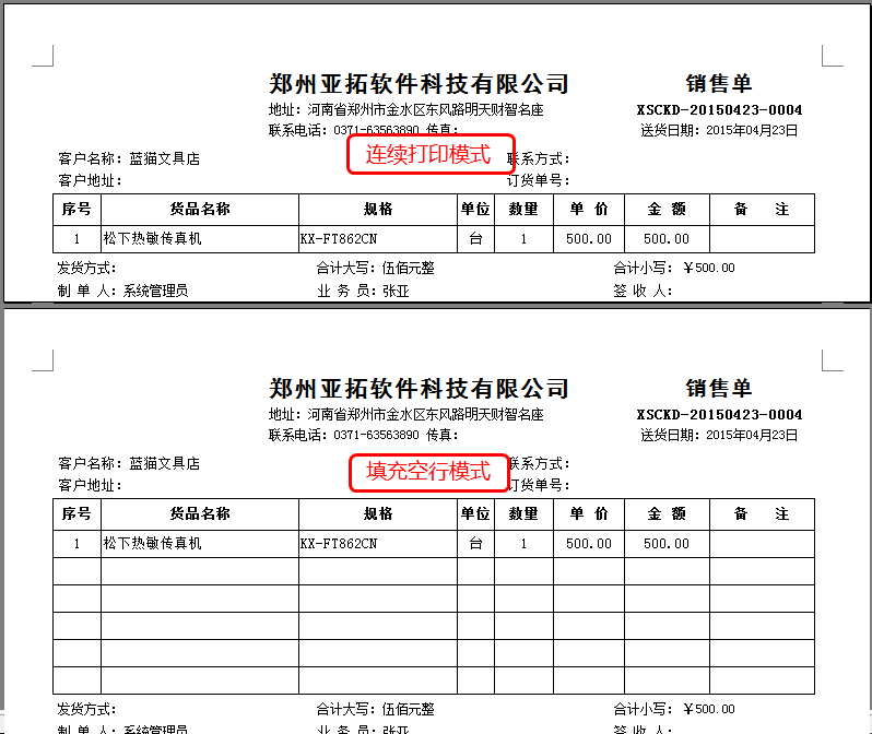 ????下圖為采用“連續打印模式”和“填充空行模式”打印出來的內容的不同之處:
