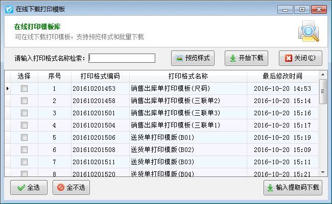 在線下載:可以從亞拓軟件在線打印格式模板庫中下載打印格式模板,試用版和免費版用戶只能下載 10 個打印格式模板。正式版用戶可以通過輸入提取碼的方式下載指定的打印格式模板。