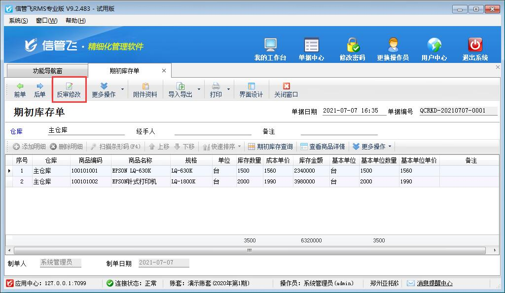 ????③開賬后,如果期初數量發現有錯誤,可以點“其他入庫單”或“其他出庫單”(“倉庫管理”功能分組中)調整庫存數量。如果發現成本單價有錯誤,可以開“成本調整單”調整成本價。另外,開帳后,如果發現期初庫存數量或成本單價有錯誤,也可以對“期初庫存單”進行反審修改,如下圖所示,點擊“反審修改”按鈕后修改單據信息,修改后保存單據即可。