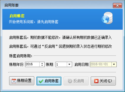 ????啟用賬期:是指準備從哪個月份開始使用軟件(舉例:假設當前月份為2016年4月份,但我們想從2016年2月份開始使用軟件,可以將啟用賬期設置為2016年、賬期為2,這樣我們需要整理的期初數據就應該是截止到2016-02-01前的期初應收應付款、期初商品庫存,開賬后就可以錄入2016-02-01之后的業務單據)。