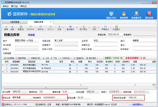 ????1、開銷售出庫單:把單據(jù)信息填好之后可以填上相應(yīng)的物流公司、物流單號以及物流代收金額,通過審核后可進(jìn)入物流代收結(jié)算模塊,如下圖1所示。