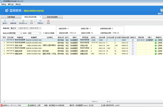 ????亞拓管理軟件支持物流代收功能,同時也可以進(jìn)行物流代收結(jié)算以及對物流公司進(jìn)行往來對賬。物流代收結(jié)算實現(xiàn)對銷售業(yè)務(wù)中我們委托物流代收金額的付款結(jié)銷,針對的結(jié)算對象為物流快遞公司,結(jié)銷后相應(yīng)應(yīng)收款的結(jié)銷狀態(tài)將發(fā)生變化。亞拓管理軟件物流代收功能使用步驟如下: