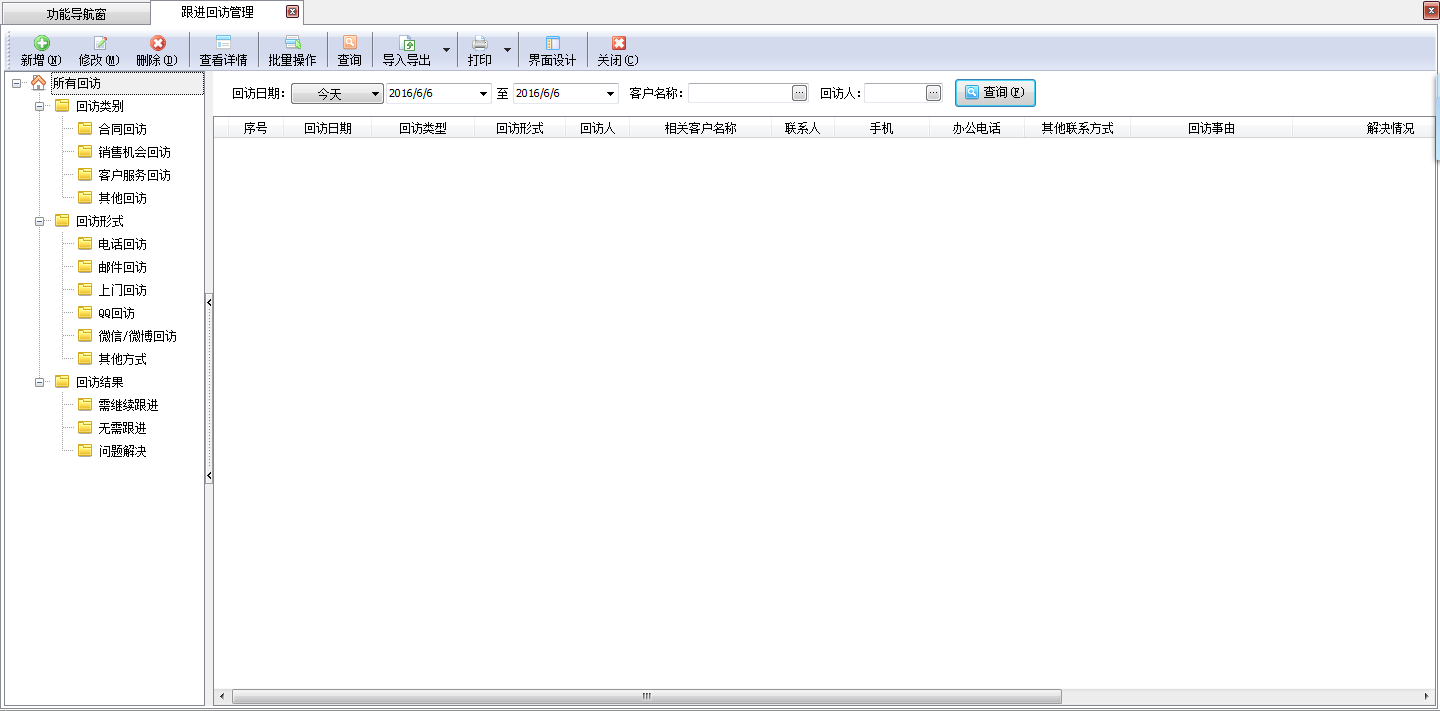 ????在功能導航窗,點“客戶關系”—》“跟蹤回訪管理”,即可進入跟蹤回訪界面,如下圖所示:
