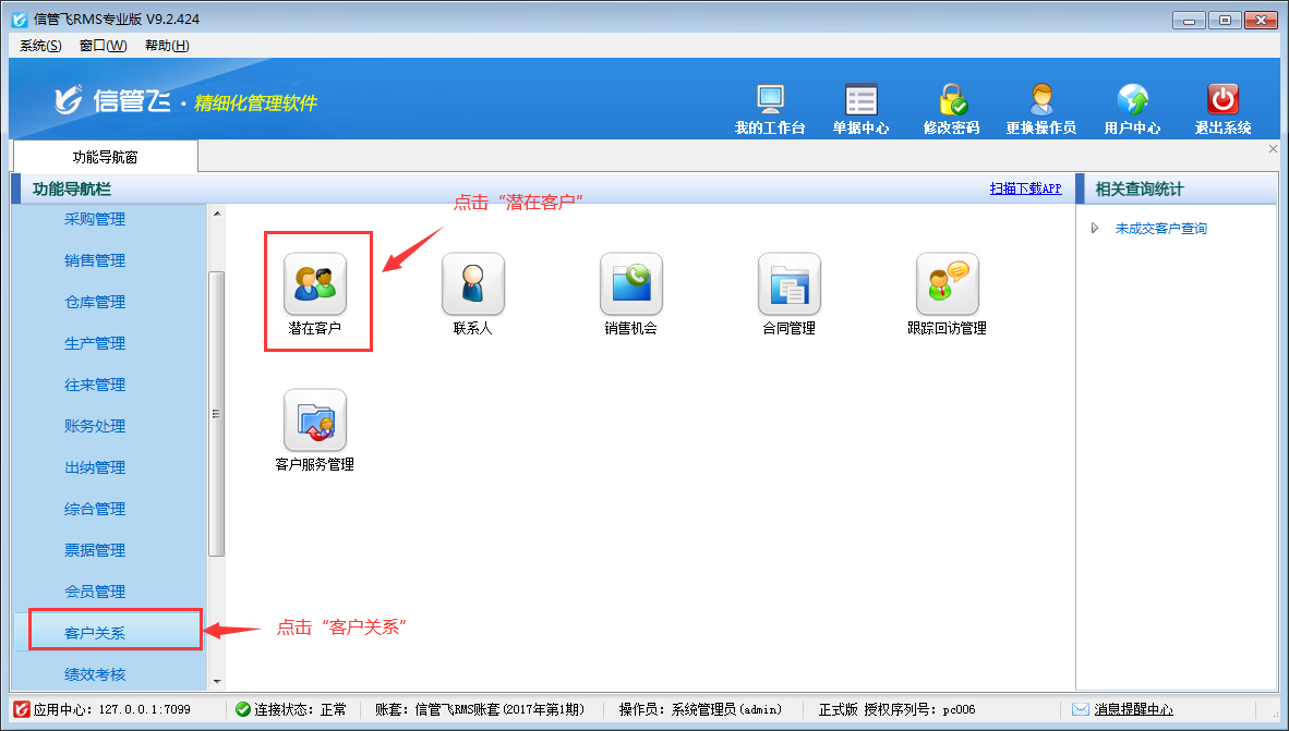 ????潛在客戶管理屬于客戶關系模塊,為信管飛RMS(進銷存管理軟件)擴展模塊,如需使用,是需要另外購買的,可聯系在線客服進行咨詢試用。