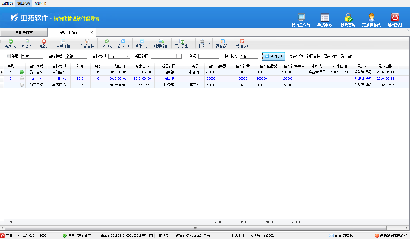 ????查詢:可以根據年度、目標性質、目標類型、部門、業務員及審核狀態等條件查詢績效目標記錄。